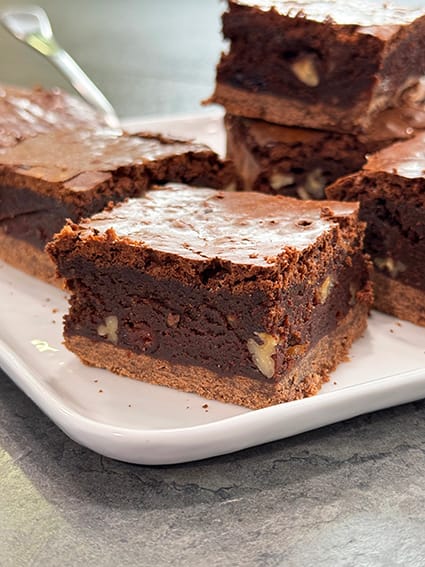 Για τη βάση: Βάλτε στον κάδο της κουζινομηχανής το αλεύρι με το βούτυρο κομμένο σε μικρά κομμάτια, τη ζάχαρη, το κακάο και το νερό και ζυμώστε με το φτερό. Απλώστε την ζύμη πάνω σε λαδόκολλα σε μία φόρμα με διαστάσεις 20 Χ 20 εκ.