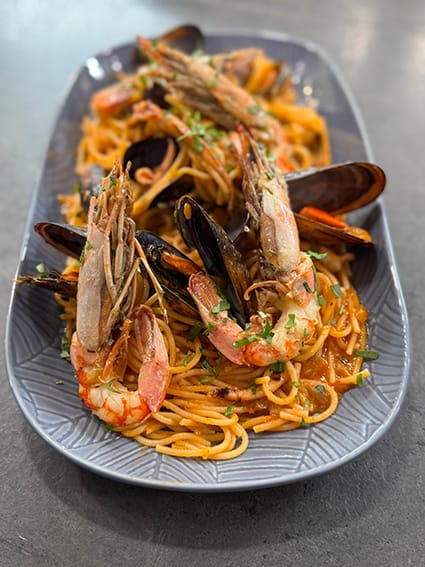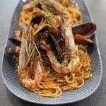Αφού βράσουν τα ζυμαρικά, ρίξτε τα μύδια στη σάλτσα και ανακατέψτε. Σερβίρετε στα πιάτα, βάλτε τις γαρίδες πάνω στα ζυμαρικά και πασπαλίστε με τον μαϊντανό.